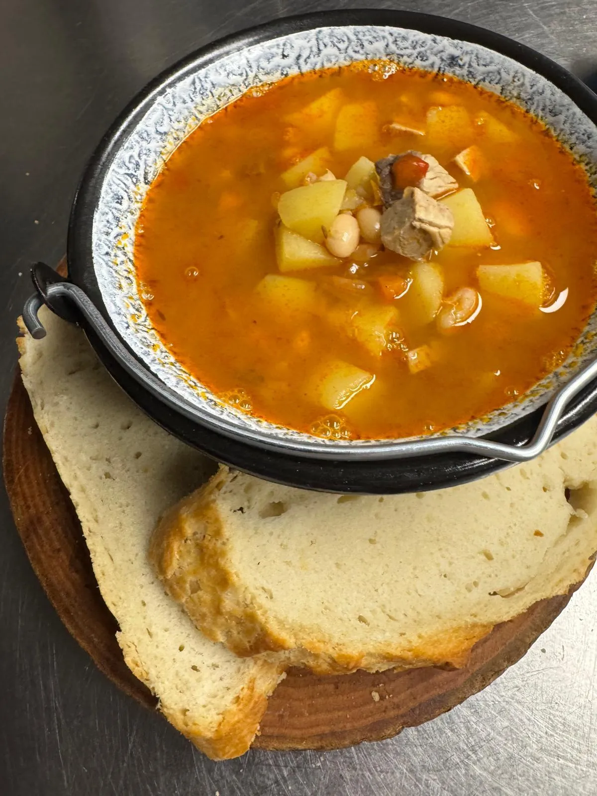 Kräftige Rindfleischsuppe mit Paprika, Kartoffeln und feinen Gewürzen – nach traditioneller Rezeptur.