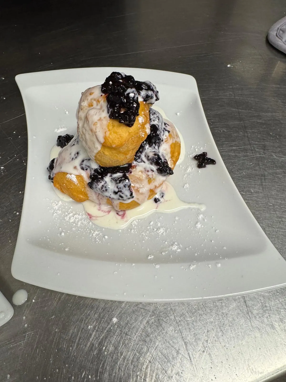 Traditionelles rumänisches Quarkgebäck, serviert mit Sauerrahm und hausgemachter Fruchtkonfitüre.
